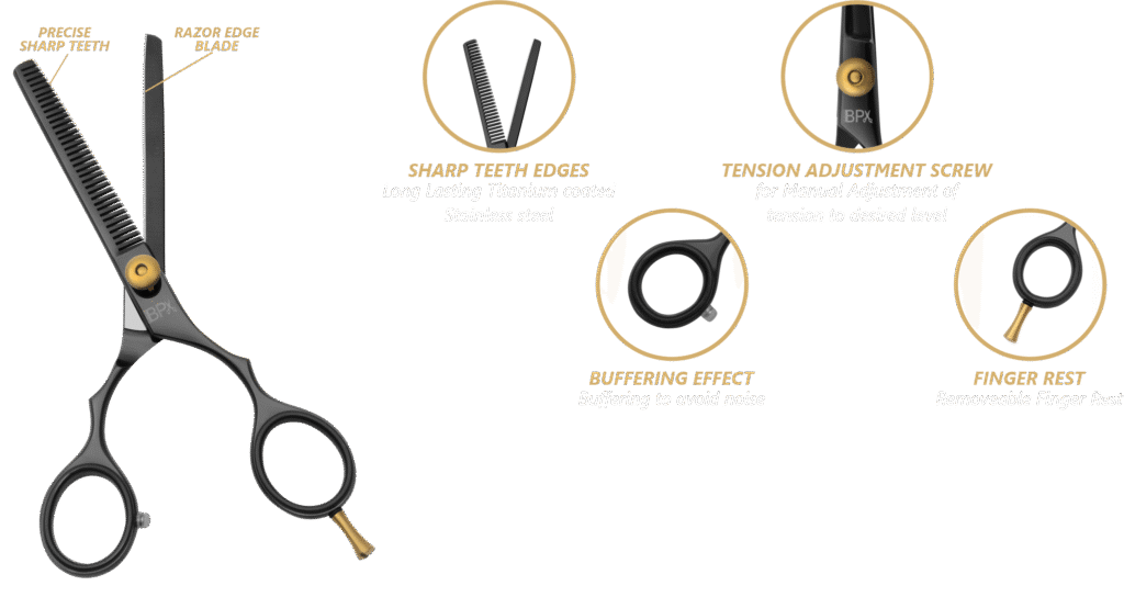 BPX Premium Barber Thinning Shears Single Packed 6 inch is forged from premium stainless steel titanium coated for long term corrosion resistance.